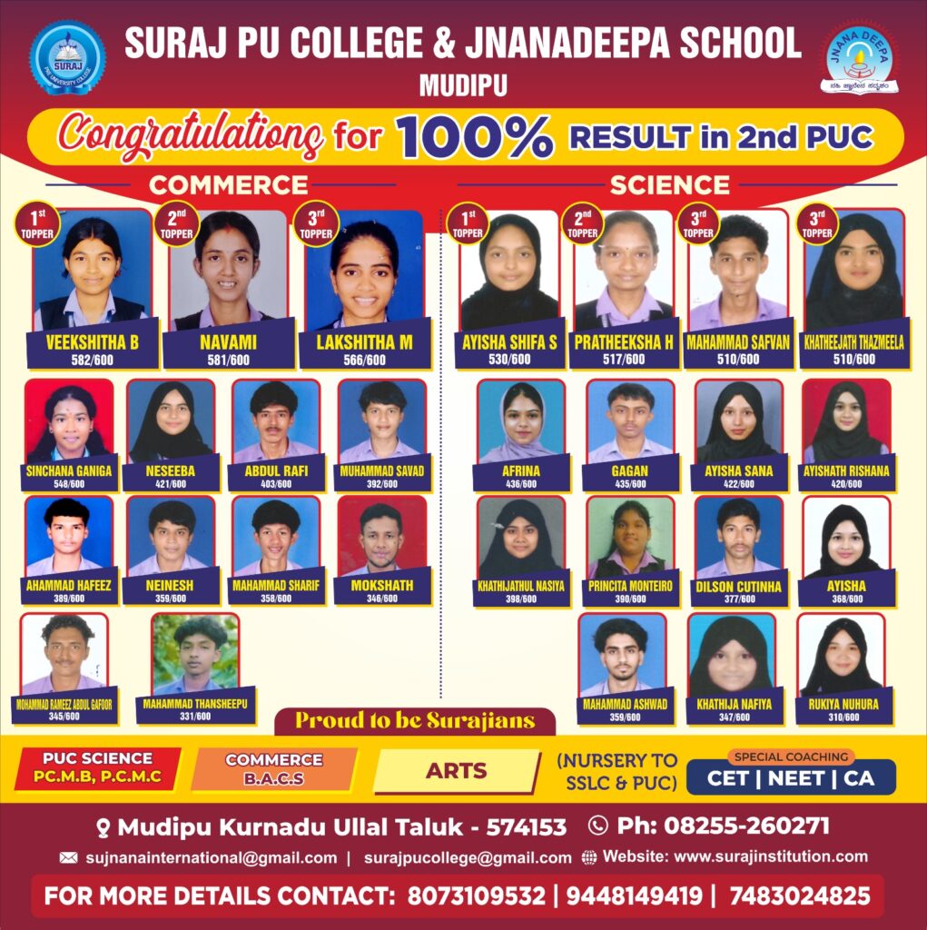 ಮುಡಿಪು: ಇಲ್ಲಿನ ಸೂರಜ್ ಪದವಿ ಪೂರ್ವ ಕಾಲೇಜು ಮತ್ತು ಜ್ಞಾನದೀಪ ಶಾಲೆ ದ್ವಿತೀಯ ಪಿಯುಸಿ ಪರೀಕ್ಷೆಯಲ್ಲಿ 100% ಫಲಿತಾಂಶ ದಾಖಲಿಸುವ ಮೂಲಕ ಶೈಕ್ಷಣಿಕ ಕ್ಷೇತ್ರದಲ್ಲಿ ಅಭೂತಪೂರ್ವ ಸಾಧನೆ ಮಾಡಿದೆ.