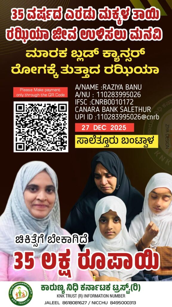 ವಿಟ್ಲ: ಸಾಲೆತ್ತೂರು ಕೋಳ್ನಾಡಿನ ಎರಡು ಮಕ್ಕಳ ತಾಯಿ ರಝಿಯಾ ರವರು ಮಾರಕ ಬ್ಲಡ್ ಕ್ಯಾನ್ಸರ್ ರೋಗಕ್ಕೆ ತುತ್ತಾಗಿದ್ದು ಶಸ್ತ್ರಚಿಕಿತ್ಸೆಗಾಗಿ ವೈದ್ಯರು 35ಲಕ್ಷ ವೆಚ್ಚವನ್ನ ಅಂದಾಜಿಸಿದ್ದಾರೆ. ರಝಿಯಾ ಗಂಡ ವೃತ್ತಿಯಲ್ಲಿ ಗಾರೆ ಕೆಲಸ ಮಾಡುತ್ತಿದ್ದು ದೈನಂದಿನ ಜೀವನ ಅದರಿಂದಲೇ ನಿಭಾಯಿಸುತ್ತಿದ್ದರು. ಹಕೀಂ ರವರು ಊರಿನಲ್ಲಿ ಸಮಾಜ ಮುಖಿ ಕೆಲಸಗಳನ್ನ ಮಾಡಿ ಊರಿನ ಸರ್ವಧರ್ಮೀಯರಿಗೂ ಪ್ರೀತಿಪಾತ್ರರಾದ ವ್ಯಕ್ತಿಯಾಗಿರುತ್ತಾರೆ.