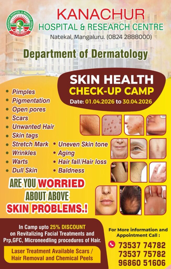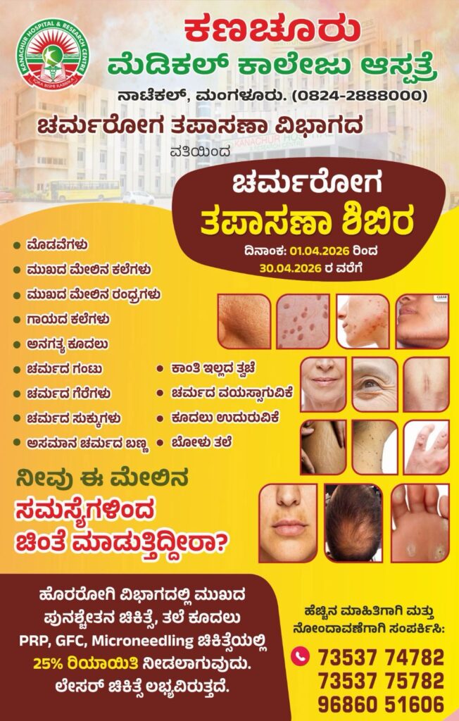 ದೇರಳಕಟ್ಟೆ: ಪ್ರಸ್ತುತ ಬದಲಾಗುತ್ತಿರುವ ಜೀವನಶೈಲಿ ಮತ್ತು ಪರಿಸರ ಮಾಲಿನ್ಯದಿಂದಾಗಿ ಚರ್ಮದ ಸಮಸ್ಯೆಗಳು ಹೆಚ್ಚಾಗುತ್ತಿವೆ. ಈ ಹಿನ್ನೆಲೆಯಲ್ಲಿ ಸಾರ್ವಜನಿಕರ ಆರೋಗ್ಯದ ದೃಷ್ಟಿಯಿಂದ ಮಂಗಳೂರಿನ ನಾಟೇಕಲ್ನಲ್ಲಿರುವ ಕಣಚೂರು ಮೆಡಿಕಲ್ ಕಾಲೇಜು ಆಸ್ಪತ್ರೆಯು ವಿಶೇಷ ‘ಚರ್ಮರೋಗ ತಪಾಸಣಾ ಶಿಬಿರ’ವನ್ನು ಆಯೋಜಿಸಿದೆ.