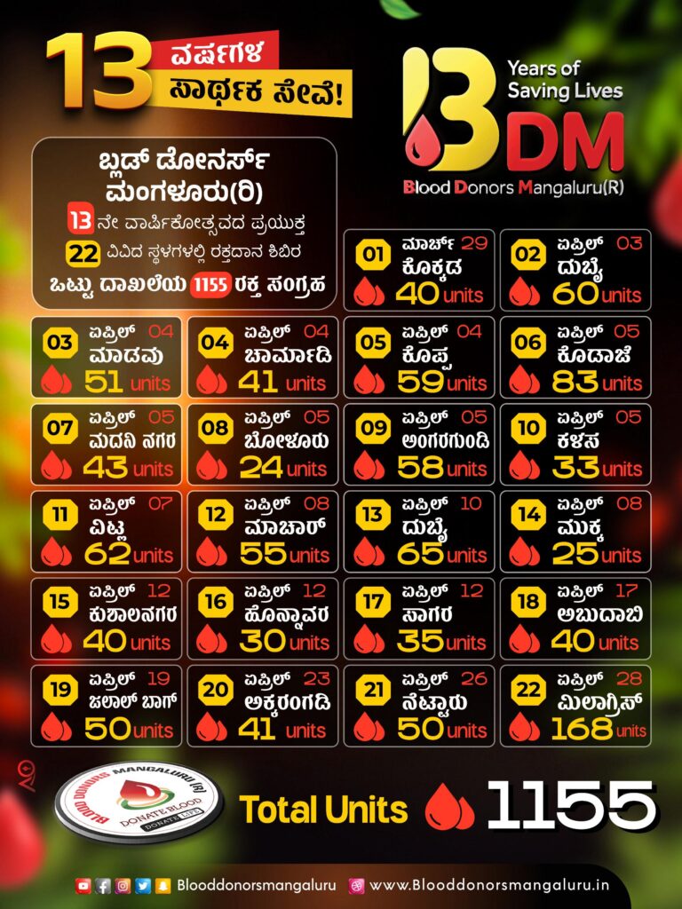 ಬ್ಲಡ್ ಡೋನರ್ಸ್ ಮಂಗಳೂರು ಸಂಸ್ಥೆಯೊಂದಿಗೆ ಕೈಜೋಡಿಸುವ ವಿವಿಧ ಸಂಘ ಸಂಸ್ಥೆಗಳ ಅಪಾರ ಸಹಕಾರದಿಂದ 22 ರಕ್ತದಾನ ಶಿಬಿರಗಳು ಆಯೋಜಿಸುವ ಮೂಲಕ 1155 ಯುನಿಟ್ಸ್ ರಕ್ತ ಸಂಗ್ರಯ ಇದು ರಾಜ್ಯದ ಹೊಸ ದಾಖಲೆಯಾಗಿದೆ.