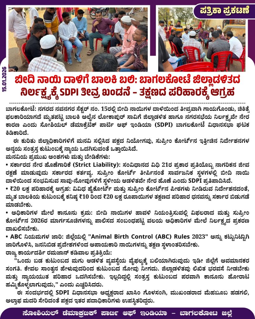 ಬಾಗಲಕೋಟೆ: ನಗರದ ನವನಗರ ಸೆಕ್ಟರ್ ನಂ. 15ರಲ್ಲಿ ಬೀದಿ ನಾಯಿಗಳ ದಾಳಿಯಿಂದ ತೀವ್ರವಾಗಿ ಗಾಯಗೊಂಡು, ಚಿಕಿತ್ಸೆ ಫಲಕಾರಿಯಾಗದೆ ಮೃತಪಟ್ಟ ಬಾಲಕಿ ಅಲೈನ ಲೋಕಾಪುರ್ ಸಾವಿಗೆ ಜಿಲ್ಲಾಡಳಿತ ಹಾಗೂ ನಗರಸಭೆಯ ನಿರ್ಲಕ್ಷ್ಯವೇ ನೇರ ಕಾರಣ ಎಂದು ಸೋಶಿಯಲ್ ಡೆಮಾಕ್ರೆಟಿಕ್ ಪಾರ್ಟಿ ಆಫ್ ಇಂಡಿಯಾ (SDPI) ಬಾಗಲಕೋಟೆ ವಿಧಾನಸಭಾ ಘಟಕ ಕಿಡಿಕಾರಿದೆ.