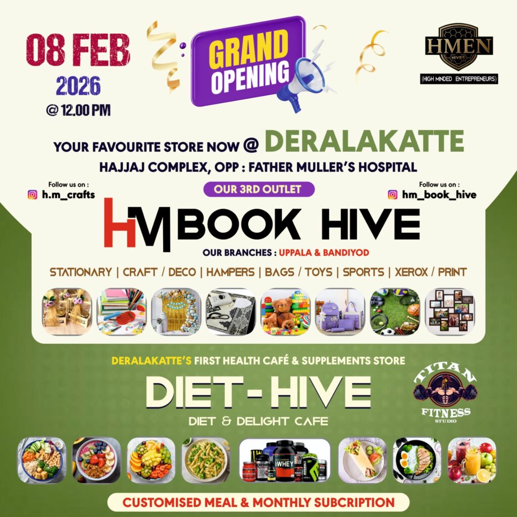 ಇದಕ್ಕೂ ಮೊದಲು ಉಪ್ಪಳ ಹಾಗೂ ಬಂದ್ಯೋಡ್ ನಲ್ಲಿ ಯಶಸ್ವಿಯಾಗಿ ಕಾರ್ಯನಿರ್ವಹಿಸುತ್ತಿರುವ HM BOOK HIVE ಇದೀಗ ದೇರಳಕಟ್ಟೆ ಯಲ್ಲೂ ತನ್ನ ಸೇವೆಯನ್ನು ವಿಸ್ತರಿಸಿದೆ. ಇಲ್ಲಿ ಸ್ಟೇಷನರಿ, ಕ್ರಾಫ್ಟ್ ಮತ್ತು ಡೆಕೊರೇಶನ್ ಸಾಮಗ್ರಿಗಳು, ಹ್ಯಾಂಪರ್ಸ್, ಬ್ಯಾಗ್ಸ್, ಆಟಿಕೆಗಳು, ಕ್ರೀಡಾ ಸಾಮಗ್ರಿಗಳು, ಜೆರಾಕ್ಸ್ ಹಾಗೂ ಪ್ರಿಂಟ್ ಸೇವೆಗಳು ಒಂದೇ ಸ್ಥಳದಲ್ಲಿ ಲಭ್ಯವಾಗಿವ.ಇ ದರೊಂದಿಗೆ ದೇರಳಕಟ್ಟೆಯ ಮೊದಲ ಹೆಲ್ತ್ ಕಫೆ ಮತ್ತು ಸಪ್ಲಿಮೆಂಟ್ಸ್ ಸ್ಟೋರ್ ಆಗಿ “DIET-HIVE – Diet & Delight Cafe” ಕೂಡ ಆರಂಭಗೊಳ್ಳುತ್ತಿದೆ.