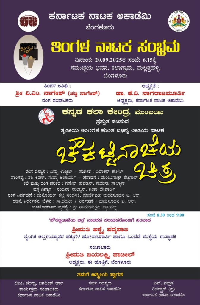 ಮುಂಬಯಿ, ಸೆ.15: ಕರ್ನಾಟಕ ನಾಟಕ ಅಕಾಡೆಮಿ ಬೆಂಗಳೂರು ಇದರ ತಿಂಗಳ ನಾಟಕ ಸಂಭ್ರಮದಡಿಯಲ್ಲಿ ಬೆಂಗಳೂರುನ ಮಲ್ಲತ್ತಹಳ್ಳಿಯಲ್ಲಿ ಅಲ್ಲಿನ ಕಲಾಗ್ರಾಮ ಸಮುಚ್ಛಯ ಭವನದಲ್ಲಿ ಇದೇ ಬರುವ ಶನಿವಾರ (ಸೆ.20) ಸಂಜೆ 6:00 ಗಂಟೆಗೆ ‘ಚೌಕಟ್ಟಿನಾಚೆಯ ಚಿತ್ರ’ ನಾಟಕವನ್ನು ಪ್ರಸ್ತುತ ಪಡಿಸಲಿದ್ದಾರೆ. ತೃತೀಯ ಲಿಂಗಿಗಳ ಬದುಕಿನ ಕಥೆವ್ಯಥೆಯುಳ್ಳ ನಾಟಕವನ್ನು ಮುಂಬಯಿಯಲ್ಲಿನ ಹೆಸರಾಂತ ರಂಗಕರ್ಮಿ ಸಾ.ದಯಾ (ದಯಾನಂದ್) ರಚನೆ ಮತ್ತು ನಿರ್ದೇಶನದಲ್ಲಿ ಪ್ರದರ್ಶನ ಕಾಣಲಿದೆ. ಕರ್ನಾಟಕ ನಾಟಕ ಅಕಾಡೆಮಿ ಅಧ್ಯಕ್ಷ ಡಾ| ಕೆ.ವಿ ನಾಗರಾಜಮೂರ್ತಿ ಅಧ್ಯಕ್ಷತೆಯಲ್ಲಿ ಅಂದು ಜರಗುವ ಕಾರ್ಯಕ್ರಮದಲ್ಲಿ ತಿಂಗಳ ಅತಿಥಿಯಾಗಿ ರಂಗ ಸಂಘಟಕ ವಿ.ಎಂ ನಾಗೇಶ್ (ಚಡ್ಡಿ ನಾಗೇಶ್) ಆಗಮಿಸಲಿರುವರು.