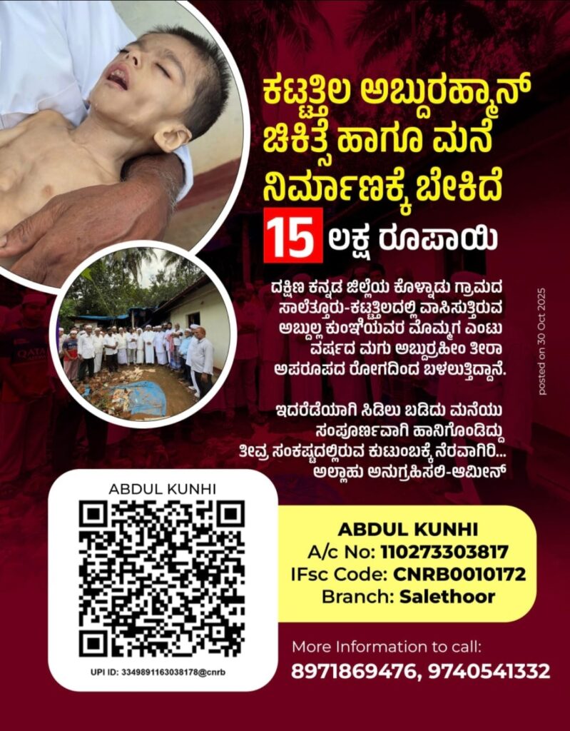 ವಿಟ್ಲ: ದಕ್ಷಿಣ ಕನ್ನಡ ಜಿಲ್ಲೆಯ ಕೊಳ್ನಾಡು ಗ್ರಾಮದ ಸಾಲೆತ್ತೂರು-ಕಟ್ಟತ್ತಿಲದಲ್ಲಿ ವಾಸಿಸುತ್ತಿರುವ ಅಬ್ದುಲ್ಲ ಕುಂಞಿಯವರ ಮೊಮ್ಮಗ ಎಂಟು ವರ್ಷದ ಮಗು ಅಬ್ದುರ್ರಹೀಂ ತೀರಾ ಅಪರೂಪದ ರೋಗದಿಂದ ಬಳಲುತ್ತಿದ್ದಾನೆ.