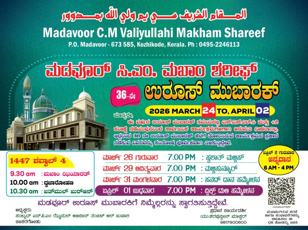 ಕಲ್ಲಿಕೋಟೆ: ದಕ್ಷಿಣ ಭಾರತದ ಪ್ರಸಿದ್ದ ಝಿಯಾರತ್ ಕೇಂದ್ರವಾದ ಮಡವೂರ್ ಸಿ.ಎಂ. ಮಖಾಂ ಶರೀಫಿನಲ್ಲಿ ಅಂತ್ಯವಿಶ್ರಾಂತಿ ಹೂಂದಿರುವ ಸಿಎಂ ಮುಹಮ್ಮದ್ ಅಬೂಬಕರ್ ಮುಸ್ಲಿಯಾರ್ (ಖ.ಸಿ.)ರವರ 36ನೇ ಉರೂಸ್ ಸಮಾರಂಭವು 2026 ಮಾರ್ಚ್ 24ರಿಂದ ಎಪ್ರಿಲ್ 2ರವರೆಗೆ ನಡೆಯಲಿದೆ.