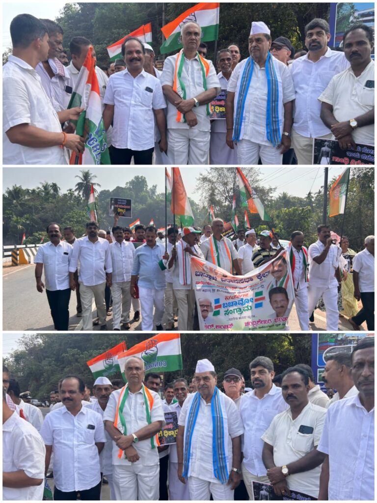 ಬಂಟ್ವಾಳ: ವಿಧಾನಸಭಾ ಕ್ಷೇತ್ರದ ಬಂಟ್ವಾಳ ಹಾಗೂ ಪಾಣೆಮಂಗಳೂರು ಬ್ಲಾಕ್ ಕಾಂಗ್ರೆಸ್ ವತಿಯಿಂದ “ನರೇಗಾ ಮರಳಿಸಿ – ಉದ್ಯೋಗದ ಹಕ್ಕು ಉಳಿಸಿ” ಎಂಬ ಘೋಷಣೆಯೊಂದಿಗೆ ನರೇಗಾ ಬಚಾವೋ ಸಂಗ್ರಾಮ ಬೃಹತ್ ಪಾದಯಾತ್ರೆ ನಡೆಯಿತು. ಮಾಜಿ ಸಚಿವರಾದ ಶ್ರೀ ಬಿ. ರಮನಾಥ ರೈ ಅವರ ನೇತೃತ್ವದಲ್ಲಿ ನಡೆದ ಈ ಪಾದಯಾತ್ರೆ ಮೂಲಕ, ನರೇಗಾ ಯೋಜನೆಯನ್ನು ದುರ್ಬಲಗೊಳಿಸುತ್ತಿರುವ ಕೇಂದ್ರ ಸರಕಾರದ ಜನವಿರೋದಿ ನೀತಿಗೆ ತೀವ್ರ ವಿರೋಧ ವ್ಯಕ್ತಪಡಿಸಲಾಯಿತು.