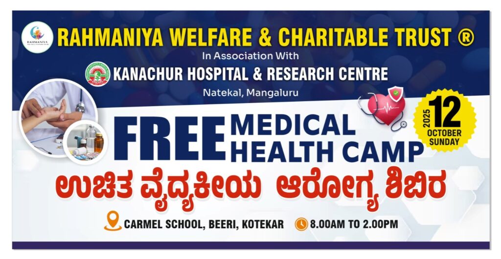 ನಾಟೆಕಲ್: ರಹ್ಮಾನಿಯಾ ವೆಲ್ಫೇರ್ ಮತ್ತು ಚಾರಿಟಬಲ್ ಟ್ರಸ್ಟ್ ನ ಪ್ರಾಯೋಜನೆಯಲ್ಲಿ, ಕನಚೂರ್ ಹಾಸ್ಪಿಟಲ್ ಮತ್ತು ರಿಸರ್ಚ್ ಸೆಂಟರ್, ನಾಟಿಕಲ್ ಸಹಯೋಗದಲ್ಲಿ ಇಂದು ದಿನಾಂಕ 12ನೇ ಅಕ್ಟೋಬರ್ 2025ರಂದು ಕಾರ್ಮೆಲ್ ಶಾಲಾವರಣ, ಬೀರಿ, ಕೋಟೆಕಾರಿನಲ್ಲಿ ಬೆಳಿಗ್ಗೆ 08:00ರಿಂದ ಮಧ್ಯಾಹ್ನ 2:00 ಗಂಟೆಯವರೆಗೆ ಉಚಿತ ವೈದ್ಯಕೀಯ ಆರೋಗ್ಯ ತಪಾಸಣೆ ಶಿಬಿರದ ಆಯೋಜನೆ ಮಾಡಲಾಗಿದೆ. ಈ ಶಿಬಿರದಲ್ಲಿ ಜನರಲ್ ಮೆಡಿಸಿನ್, ಕಣ್ಣಿನ ತಪಾಸಣೆ, ಮಕ್ಕಳ ತಜ್ಞರು, ಸ್ತ್ರೀರೋಗ ತಜ್ಞರು, ಎಲುಬಿನ ತಜ್ಞರು ಹಾಗೂ ಕಿವಿ–ಮೂಗು–ಗಂಟಲು ತಜ್ಞರುಗಳು ಸೇವೆ ನೀಡಲಿದ್ದಾರೆ. ವೈದರಾದ ಡಾ. ತಾರಾನಾಥ್ ಶೆಟ್ಟಿ (MBBS) ಅವರಿಗೆ ಅವರ 40 ವರ್ಷಗಳ ನಿಸ್ವಾರ್ಥ ವೈದ್ಯಕೀಯ ಸೇವೆಗೆ ವಿಶೇಷ ಗೌರವ ಸಲ್ಲಿಸಲಾಗುವುದು. ಸಾರ್ವಜನಿಕರು ಈ ಶಿಬಿರದ ಸಂಪೂರ್ಣ ಸದುಪಯೋಗವನ್ನು ಪಡೆದುಕೊಳ್ಳಬೇಕೆಂದು ಶಿಬಿರದ ಆಯೋಜಕರು ವಿನಂತಿಸಿಕೊಂಡಿದ್ದಾರೆ.