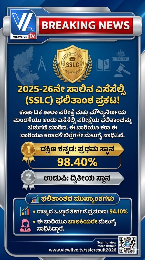 ಬೆಂಗಳೂರು: ಕರ್ನಾಟಕ ಶಾಲಾ ಪರೀಕ್ಷೆ ಮತ್ತು ಮೌಲ್ಯನಿರ್ಣಯ ಮಂಡಳಿಯು ಇಂದು ಎಸೆಸೆಲ್ಸಿ ಪರೀಕ್ಷೆಯ ಫಲಿತಾಂಶವನ್ನು ಬಿಡುಗಡೆ ಮಾಡಿದೆ. ಈ ಬಾರಿಯೂ ಕರಾವಳಿ ಜಿಲ್ಲೆಗಳೇ ಮೇಲುಗೈ ಸಾಧಿಸಿವೆ.