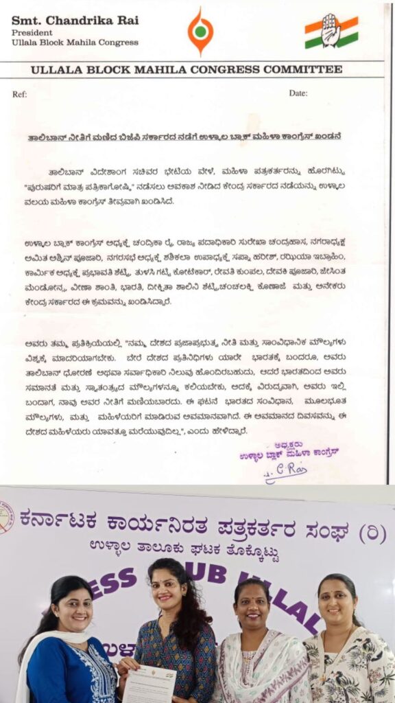 ತಾಲಿಬಾನ್ ವಿದೇಶಾಂಗ ಸಚಿವರ ಭೇಟಿಯ ವೇಳೆ, ಮಹಿಳಾ ಪತ್ರಕರ್ತರನ್ನು ಹೊರಗಿಟ್ಟು “ಪುರುಷರಿಗೆ ಮಾತ್ರ ಪತ್ರಿಕಾಗೋಷ್ಠಿ ನಡೆಸಲು ಅವಕಾಶ ನೀಡಿದ ಕೇಂದ್ರ ಸರ್ಕಾರದ ನಡೆಯನ್ನು ಉಳ್ಳಾಲ ವಲಯ ಮಹಿಳಾ ಕಾಂಗ್ರೆಸ್ ತೀವವಾಗಿ ಖಂಡಿಸಿದೆ.