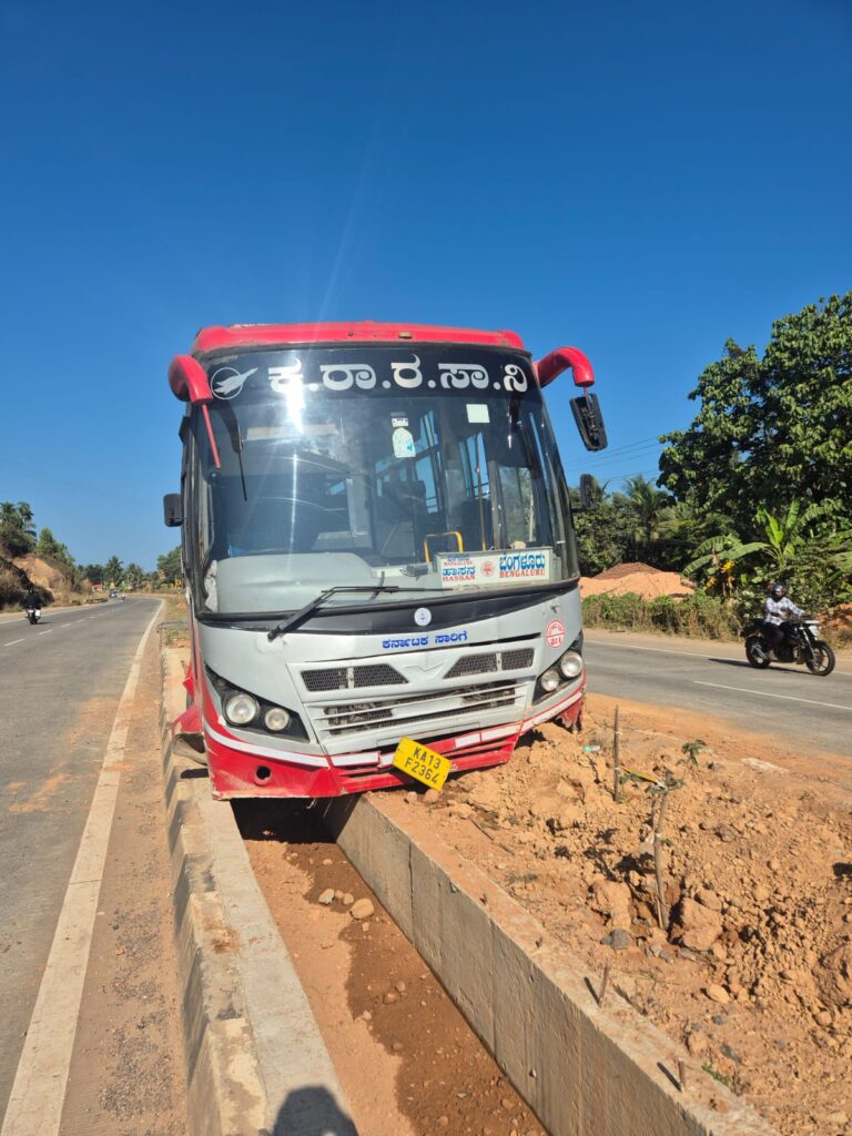 ಮಂಗಳೂರಿನಿಂದ ಹಾಸನ ಮಾರ್ಗವಾಗಿ ಬೆಂಗಳೂರಿಗೆ ತೆರಳುತ್ತಿದ್ದ ಸರ್ಕಾರಿ ಬಸ್, ಚಾಲಕ ನಿಯಂತ್ರಣ ತಪ್ಪಿ ಡಿವೈಡರ್ ಮೇಲೆ ಹತ್ತಿ ನಿಂತ ಘಟನೆ ಸೋಮವಾರ ಬೆಳಿಗ್ಗೆ ಜಾವ ನಡೆದಿದೆ.ಘಟನೆಯಲ್ಲಿ ಬಸ್ಗೆ ಭಾಗಶಃ ಹಾನಿ ಉಂಟಾಗಿದ್ದು, ಅದೃಷ್ಟವಶಾತ್ ಬಸ್ನಲ್ಲಿದ್ದ ಪ್ರಯಾಣಿಕರು ಯಾವುದೇ ಪ್ರಾಣಾಪಾಯವಿಲ್ಲದೆ ಪಾರಾಗಿದ್ದಾರೆ ಎಂದು ತಿಳಿದು ಬಂದಿದೆ.
